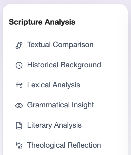 Powered by advanced AI, DX Sermon equips users to move fluidly between six powerful analytical tools, each revealing a different dimension of biblical truth. Together, they form a rich, interactive environment for discovery, discernment, and transformation.ers — it awakens insight.